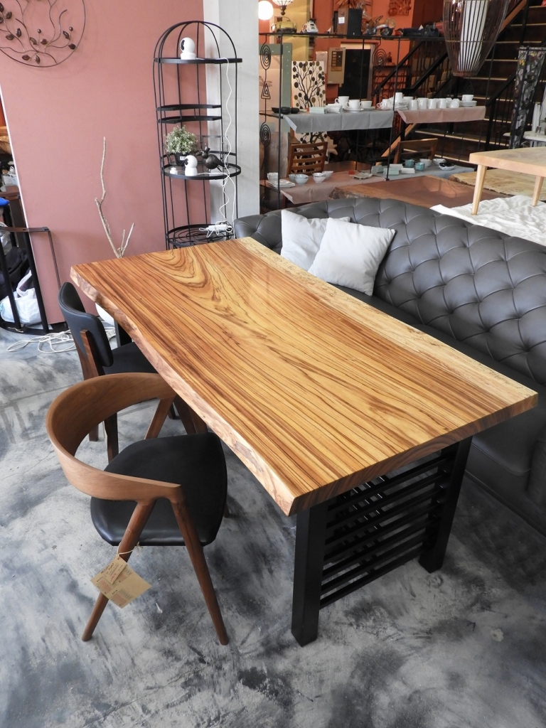 辺材は灰白色、心材は金褐色。産地によって濃い縞模様がでたり、色調は違います。成長の早い南洋材の為、年輪の幅が広がり個性的な優しい木目が出来るのです。耐久性にも優れ、テーブルには最適です