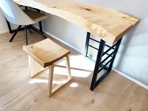 栃(トチ)の一枚板を使用したデスクです。 こちらはもともと少し湾曲した、両耳の残っている天板でしたが、 デスク用で壁にぴったりとくっつけて置きたいとのご希望で 片側をまっすぐに切り落として片耳のデスクへと加工いたしました。 きっちり設置できることで、すっきりとした印象になりますね。 凹凸の残る皮からは、綺麗な縮緬状の皺があり 栃の繊細さも十分に感じられます。 脚にはデスクにおすすめV字型脚を使用しています。 横に3本走るポールには、フックを引っ掛けて かばんを掛けたりもできますよ。 一枚板を使用したおススメのチョイススツールもお選びいただきました。 こちらの座面も一枚板を使用していますので、 どれも一点物となっております。 お好みの樹種・木目を選べる、楽しいスツールです。