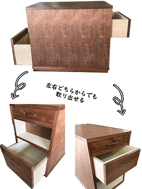 このサイドテーブルは両面から引出しが抜ける優れもの!!