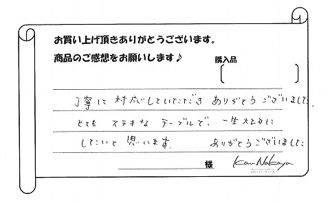 丁寧に対応していただきありがとうございました。 とてもステキなテーブルで、一生大切にしたいと思います。 ありがとうございました。