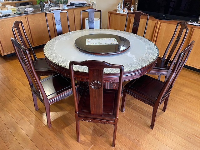 お父様が50年程前に台湾から買ってこられた ダイニングセット🌳😄 数年前にテーブルの補修と塗り直しをさせて頂き 今回はダイニングチェアーが1脚外れたのを機会に 全ての椅子のガタツキを直して 塗り直しをさせて頂きました🤗✨ 今は無い紫檀の椅子ですので、 思い出深く使われていたとの事💚 綺麗になった、私達が生きている間は又使えるね と大変喜んで頂きました😄🙌🙌 本当に良い本物は再生出来ますね✨ 喜んで頂き良かったです🎶 ありがとうございました😊