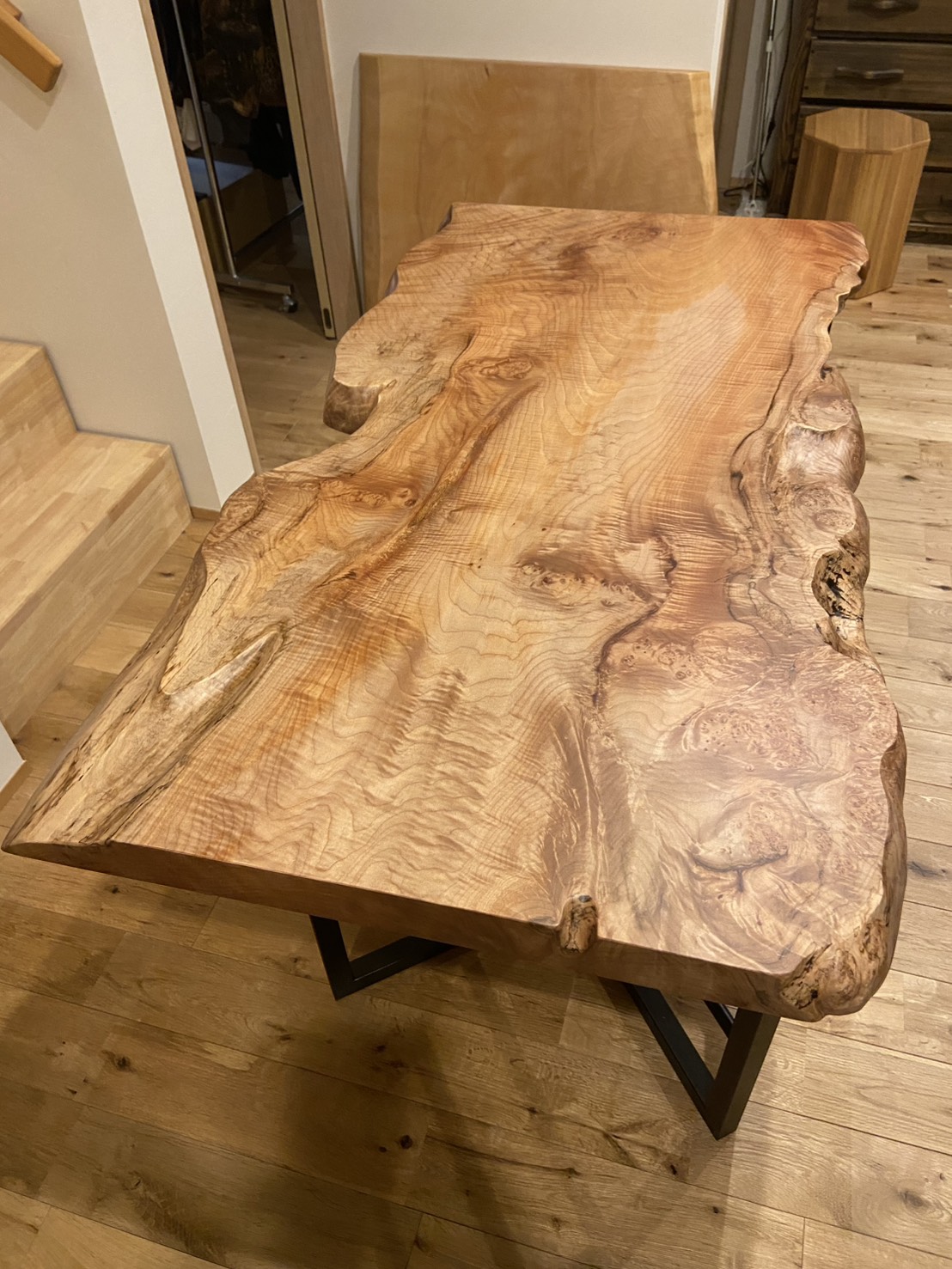 4mあるキラキラの杢が眩しい栃の一枚板天板に、一枚板用脚は、Kan Nakayaオリジナルアイアン脚を購入して頂きました。
